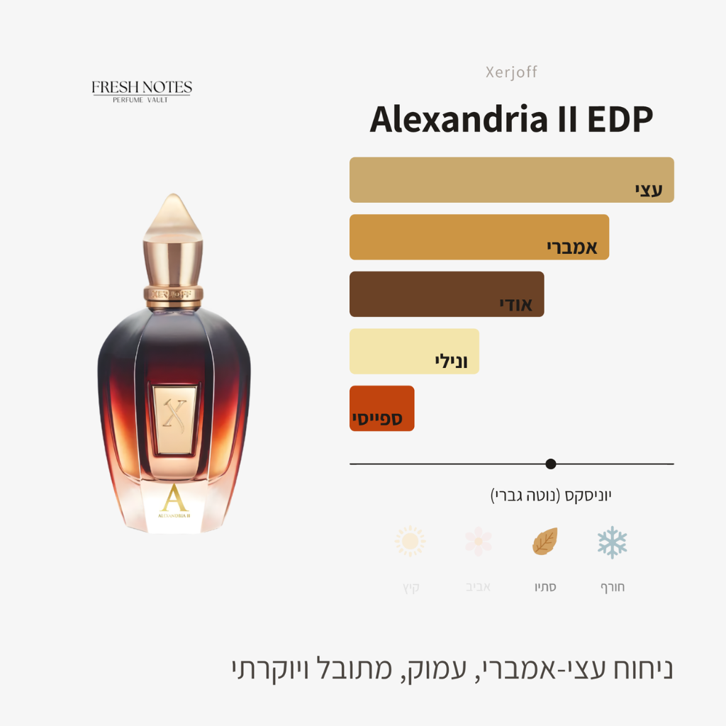 הרגע הראשון שבו Alexandria II של Xerjoff (סרג'וף) נוגע בעור מרגיש כמו התנגשות עדינה בין חום לקור, תפוח ירוק רענן מול לבנדר ארומטי שמביא איתו תחושת ניקיון, וקינמון רך שמאזן ביניהם בדיוק הנכון.