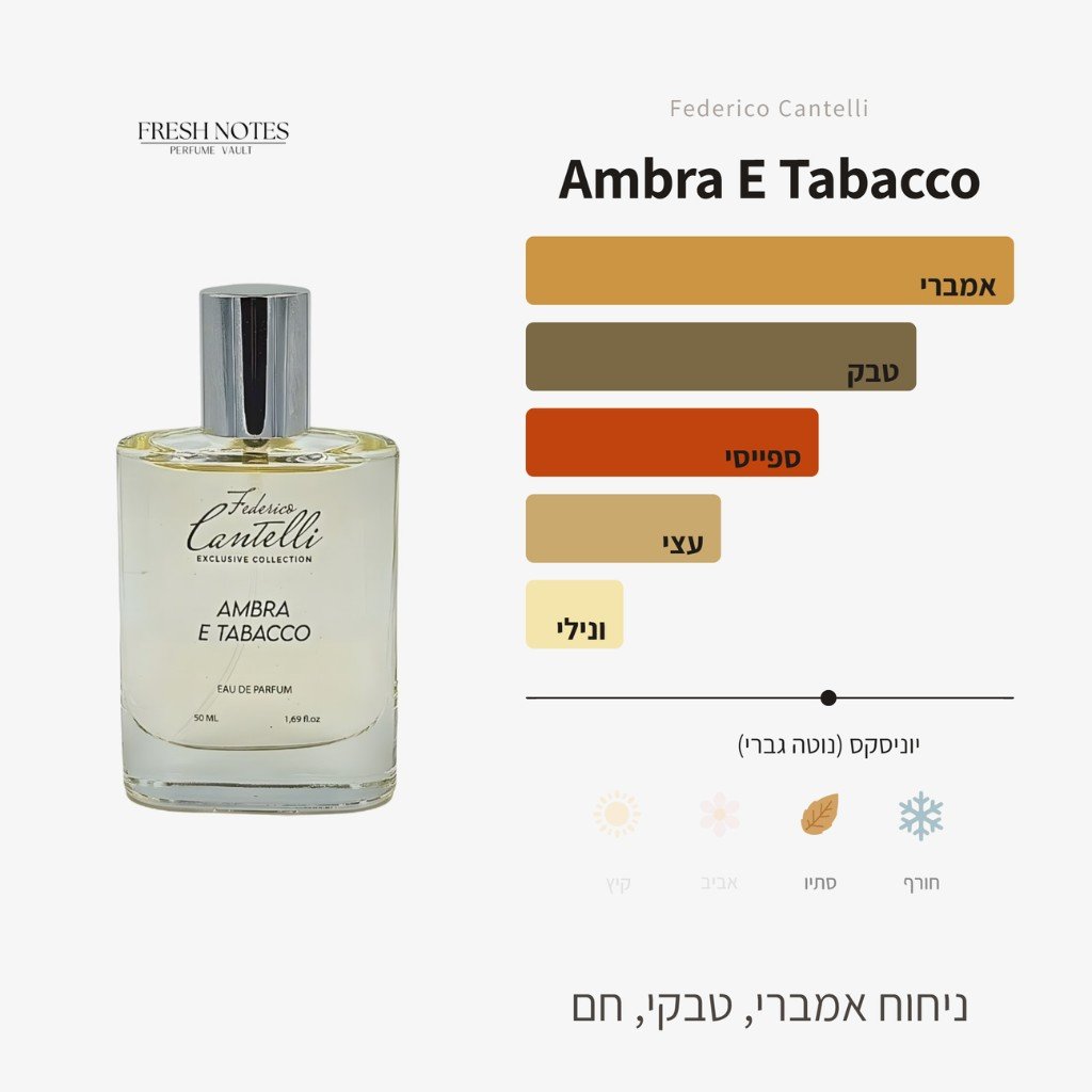 Ambra E Tabacco של המותג פדריקו קנטלי (Federico Cantelli) הוא ניחוח שנשען על ניגודיות מעניינת בין אלמנטים חמים ומתוקים לבין קרירות ארומטית.