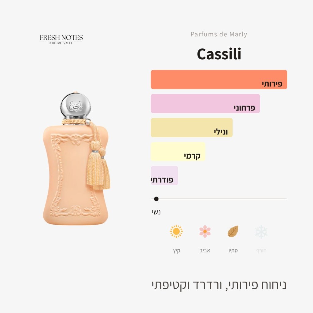 דוגמית הבושם Cassili (קאסילי) מאפשר לך להתנסות באחד הבשמים האהובים מבית פרפיום דה מארלי. קאסילי מריח כמו עור חמים אחרי מקלחת, כשמרחת קרם גוף נעים מדי ואת לובשת משהו לבן, נקי ורך. יש בו את המתיקות הקרמית של אפרסק בשל כמו קינוח רך, כמעט כמו מרנג פירות מוקצף.