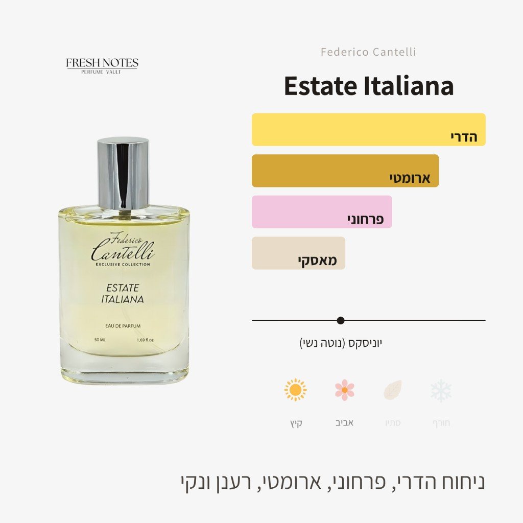אסטטה איטליאנה (Estate Italiana) הוא ניחוח שמביא לידי ביטוי את היכולת של המותג פדריקו קנטלי (Federico Cantelli) לייצר רעננות שהיא לא "גנרית".