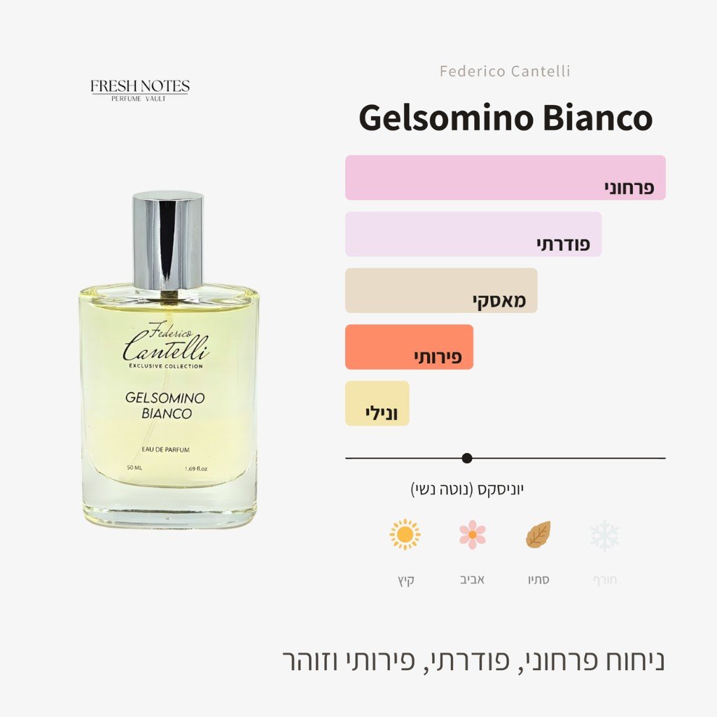 ג'לסומינו ביאנקו (Gelsomino Bianco) של פדריקו קנטלי (Federico Cantelli) הוא בושם פרחוני אבקתי שמרגיש כמו משהו שהכרתם תמיד,גם אם פגשתם אותו בפעם הראשונה.