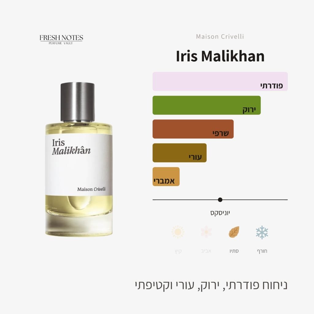 הבושם Iris Malikhan (איריס מליקן) מציע חוויה חושית המבוססת על ניגודים חדים ובלתי צפויים.