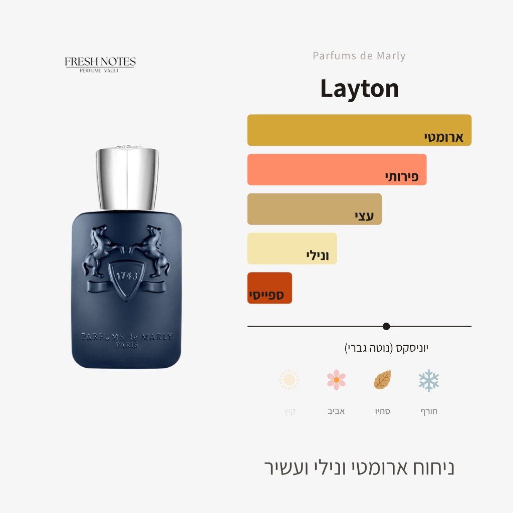 למי הדוגמית מתאימה? למי שמחפש בושם "חתימה" ורסטילי שעובד מצוין בסתיו ובחורף, אך בזכות הפתיחה הרעננה יחמיא גם באביב. אם אתם מחפשים ניחוח שהוא "מגנט מחמאות" מוכח, המשלב גבריות קלאסית עם מתיקות מודרנית ומאוזנת, דוגמית בושם Layton (לייטון) מבית Parfums de Marly היא תחנת חובה במסע שלכם.