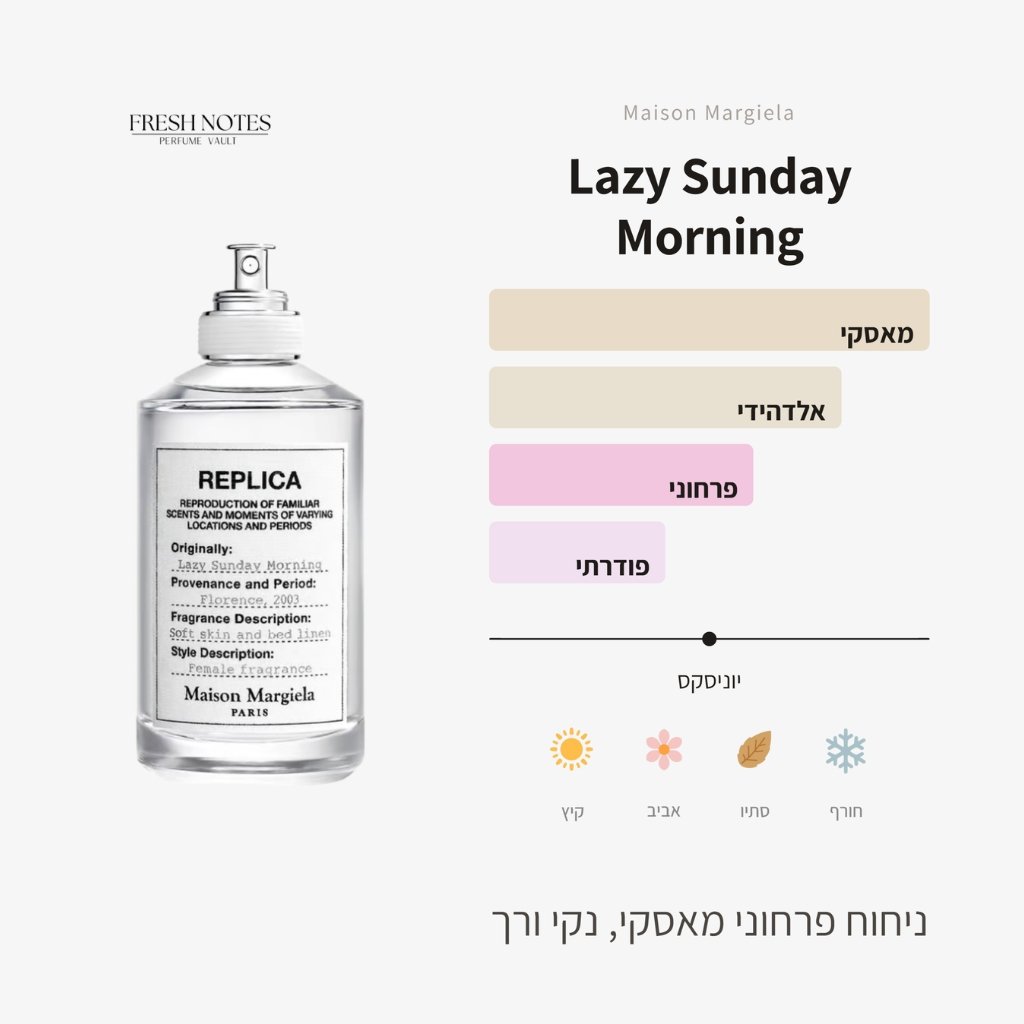 בקצרה: דוגמית Lazy Sunday Morning מסדרת רפליקה לוכד זיכרון של בוקר רגוע בפירנצה ותחושת עור רך ומצעים נקיים. הוא נפתח באלדהידים, שושנת העמקים ואגס; ליבו פודרתי עם איריס וורד. הבסיס החם משלב זרעי אמברט ומאסקים לבנים לאפקט של עור נקי וחם.