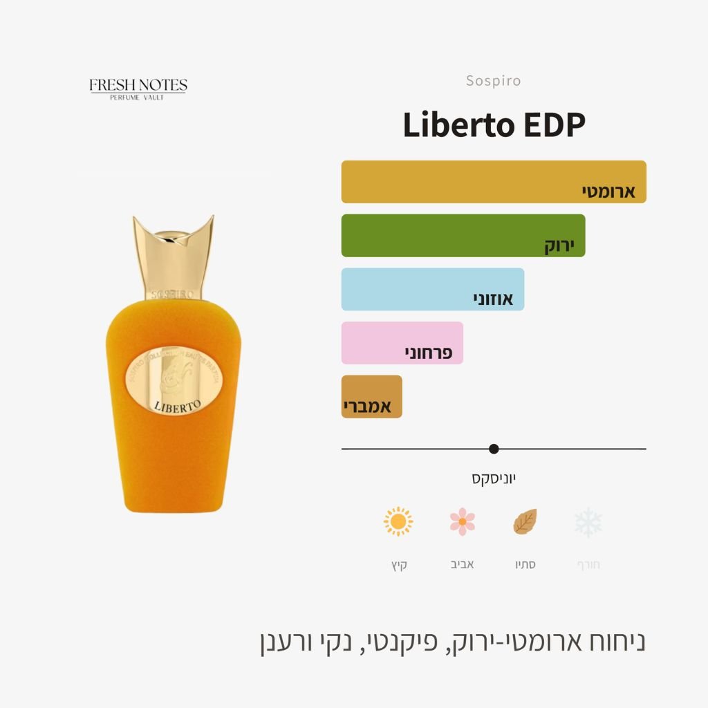 ליברטו (Liberto) מבית הבישום סוספירו (Sospiro) הוא המנון לחופש, לחיים ללא גבולות ולאומץ לתת לרוח להוביל.