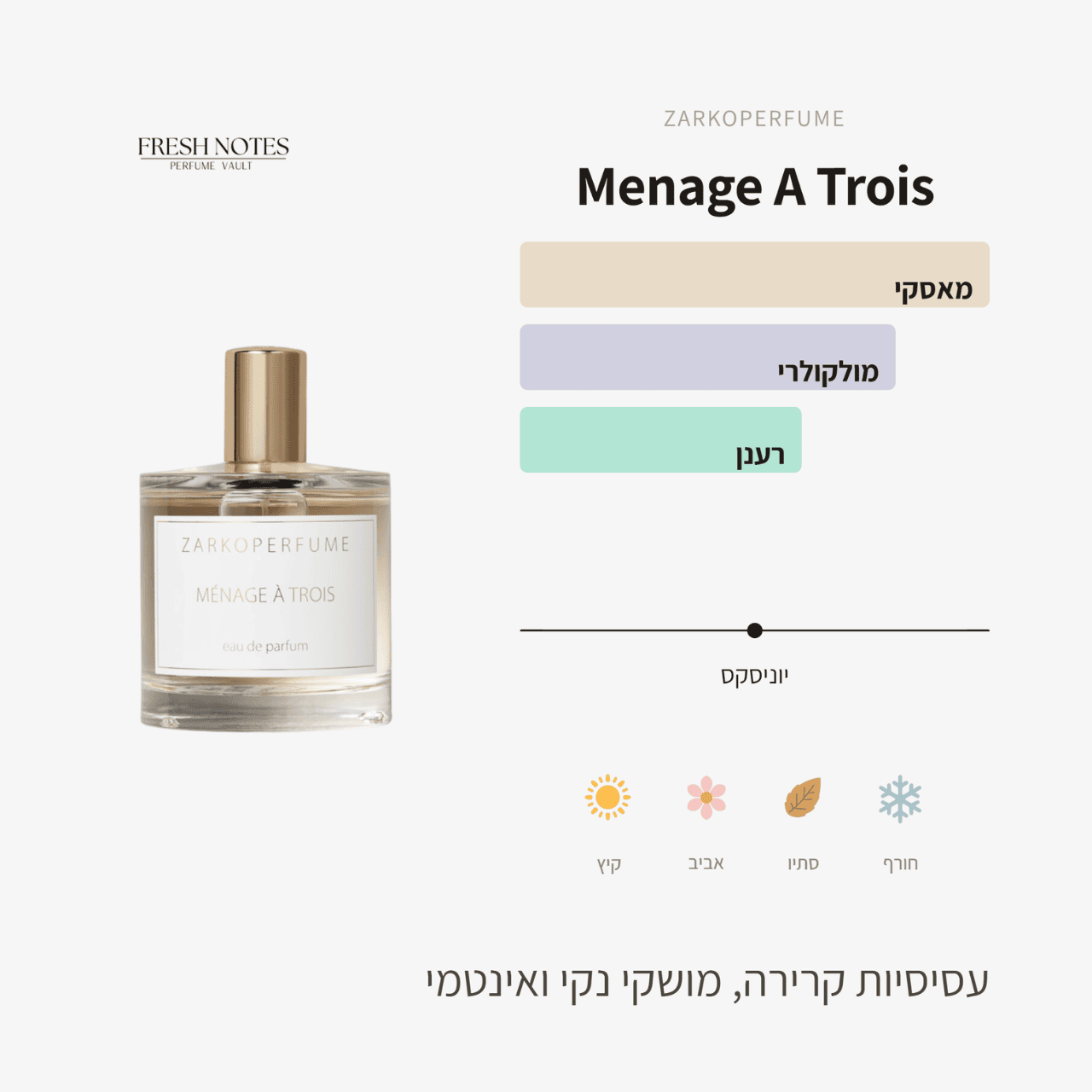 Ménage à Trois (מנאז' א-טרואה) מבית זארקו פרפיום הוא חוויה של אינטימיות נועזת ומשוחררת. הוא מתחיל בתחושה שדומה ליציאה מהמקלחת אל תוך סדינים לבנים ונקיים ביום קיץ חם תחושה של טוהר, אבל עם הבטחה למשהו עמוק יותר. הפתיחה מסחררת עם ניחוח מפתיע ומרענן של אבטיח גרוס ועסיסי. זה לא הריח הסינתטי שאתם מכירים, אלא הריח האמיתי של הפרי הקר שנשבר, מתוק-רענן, שמעורר את החושים ברגע אחד של חיות מתפרצת.