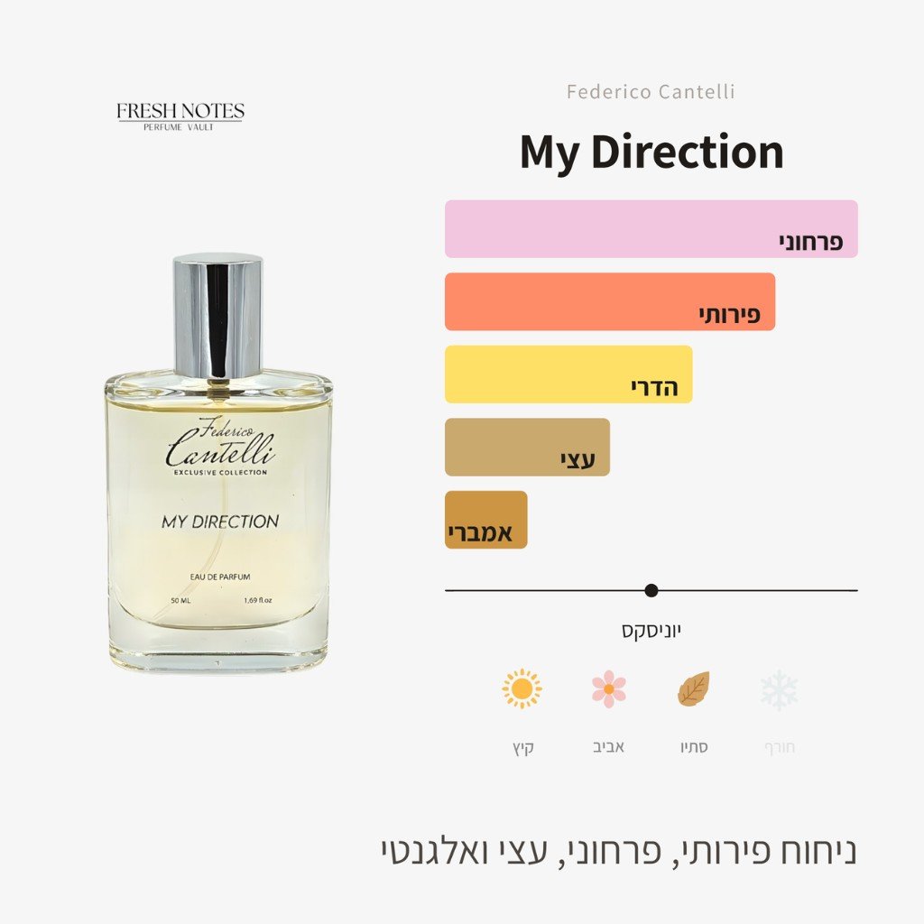 מיי דיירקשן (My Direction) של המותג פדריקו קנטלי (Federico Cantelli) הוא ניחוח שמתבסס על שילוב בין רעננות פירותית לבין לב פרחוני ועמוק.