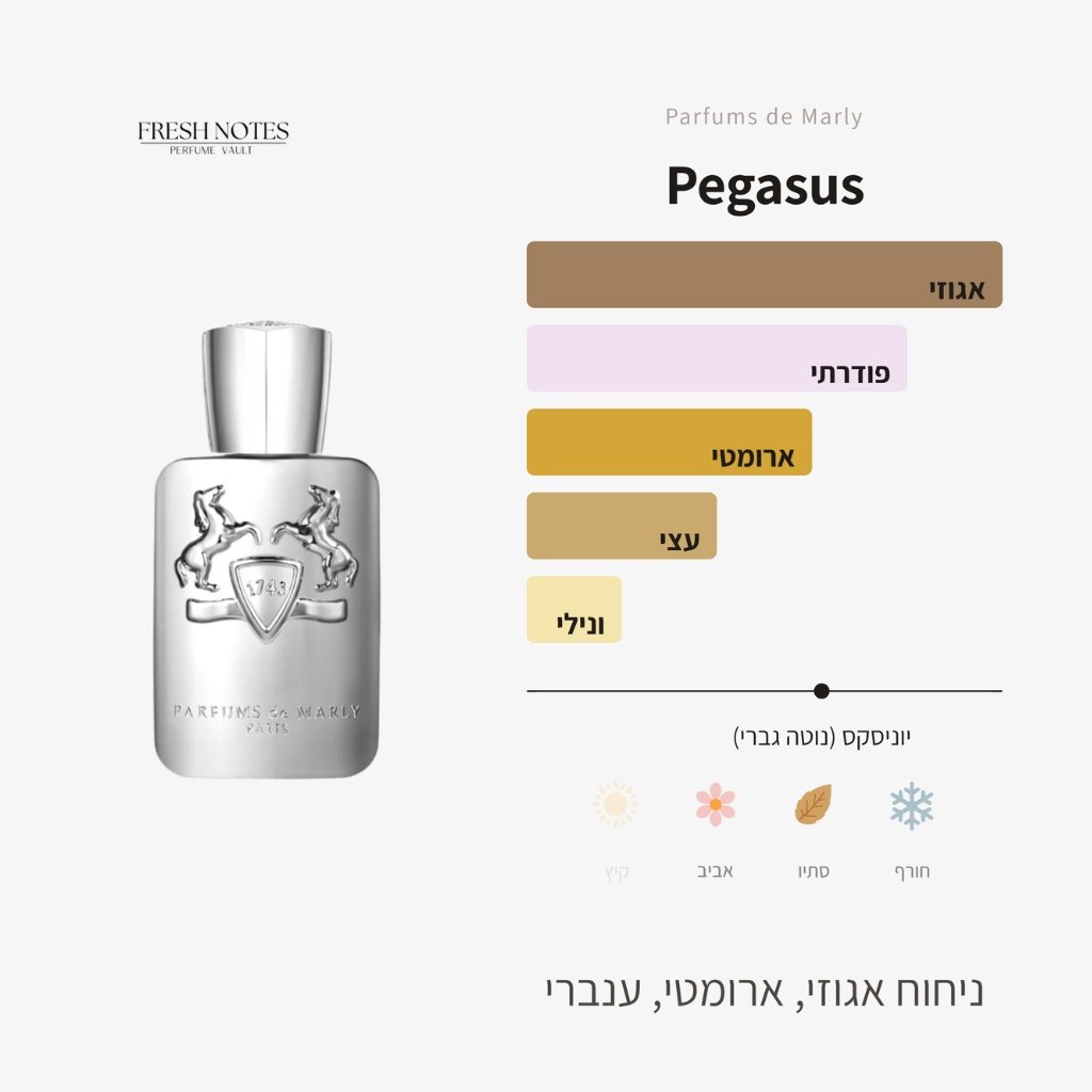 Pegasus יושב טוב על מי שאוהב מתיקות רכה, גברית־יוניסקס, עם נוכחות ברורה ותחושת גימור מוקפדת. מתאים מאוד לערב, ליציאה, לרגע שבו רוצים נוכחות נינוחה.