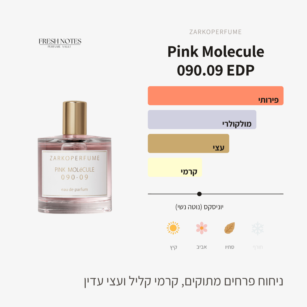 Pink Molecule 090.09 של ZARKOPERFUME הוא בדיוק זה, בושם נשי שמוותר על הלב המסורתי, ויוצר חוויה תלת מימדית, כמעט מינרלית, של ניגודים.