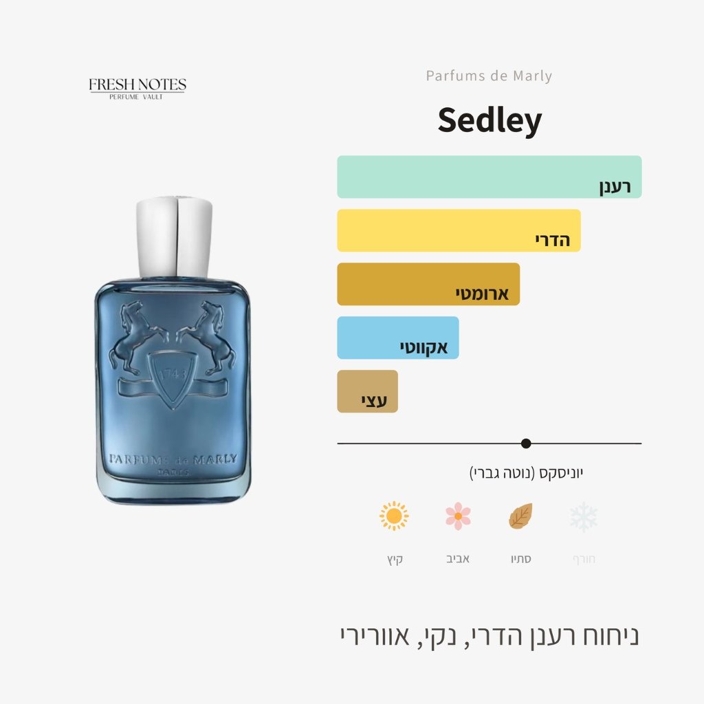 למה מומלץ להתחיל בדוגמית? Sedley הוא בושם רענן המבוסס על מולקולות מודרניות והדרים טבעיים. בשמים ממשפחה זו ידועים בכך שהם מגיבים בצורה שונה מאוד בהתאם לכימיה של העור על אנשים מסוימים הוא יחזיק שעות ארוכות ועל אחרים יהיה עדין יותר. הדוגמית תאפשר לכם לבדוק את הביצועים והעמידות שלו עליכם לאורך יום שלם לפני רכישת הבקבוק המלא.