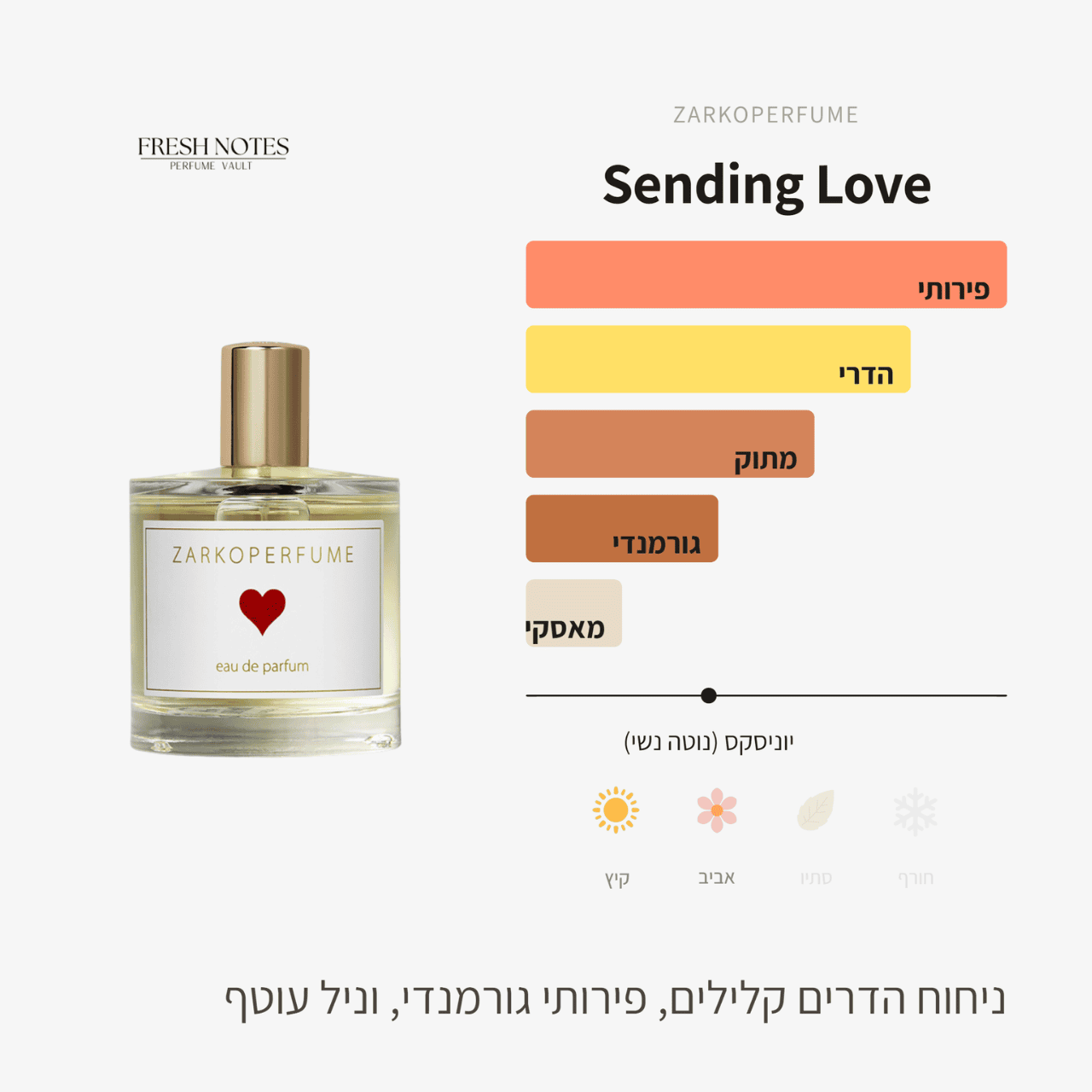 Sending Love (סנדינג לאב) מבית Zarkoperfume נולד מתוך הרעיון של אהבה וגעגוע, והוא מתרגם את הרגשות הללו לניחוח שעוטף את הגוף כמו מכתב אהבה או חיבוק חם. הבושם נפתח בפרץ אנרגטי ומעורר של לימון מתוק, ליים ירוק ומנדרינה, בשילוב האקזוטיות של פרי הדרקון (פיטאיה). זו פתיחה שמזכירה את ההתרגשות של מפגש בין אוהבים והיא רעננה ומלאת חיים.