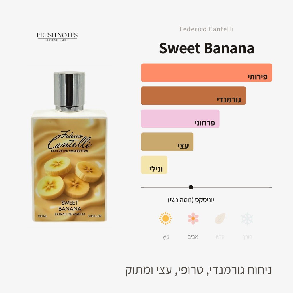 הבושם סוויט בננה (Sweet Banana) של המותג פדריקו קנטלי (Federico Cantelli) הוא ניחוח שבוחן מחדש את גבולות משפחת הגורמנד.